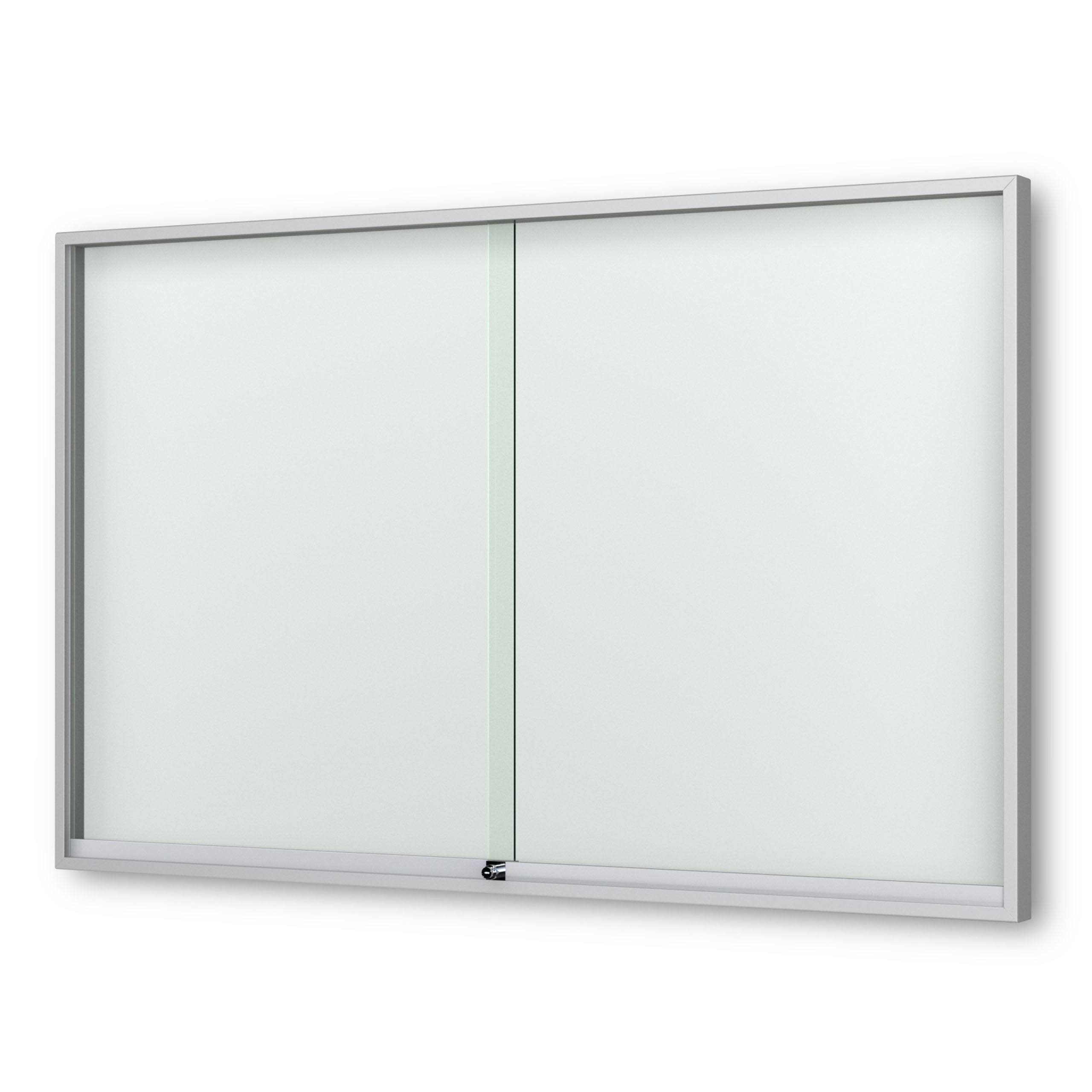 Schaukasten Fortis - eckig - mit Schiebetüren - 80 mm Gehäusetiefe, rollengelagerte Schiebetüren, höchster Brandschutz (A1) Größe - 8 × DIN A4 • 930 × 695 mm Öffnung - rollengelagerte SchiebetürenVerglasung - Einscheiben-Sicherheitsglas / ESGOberfläche - Eloxierung in matt-silber (E6/EV1)Beleuchtung - ohne BeleuchtungSchließung - Sicherheitsschlösser mit je 2 SchlüsselnRückwand - weiße, magnethaftende Rückwand inkl. 10 Magnete