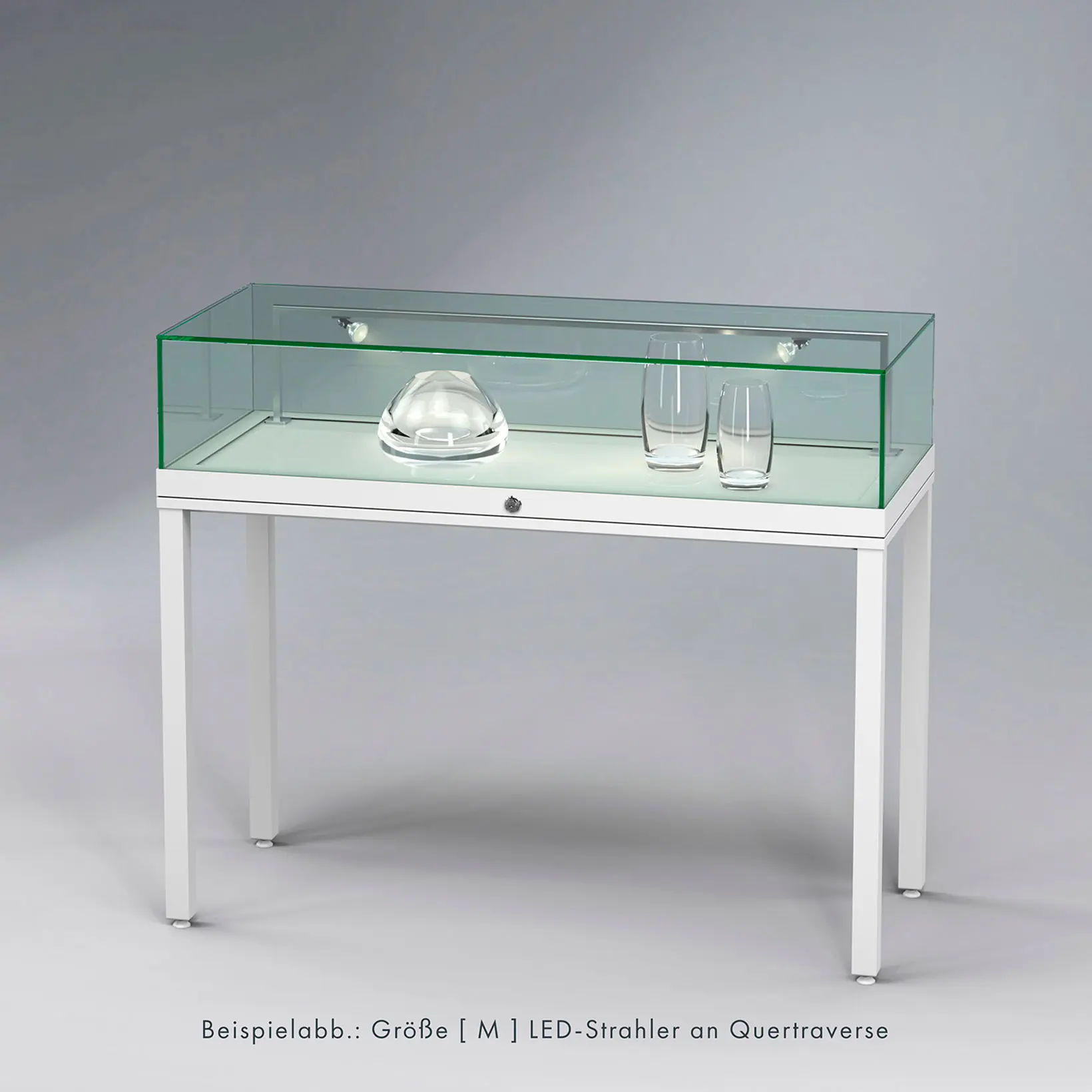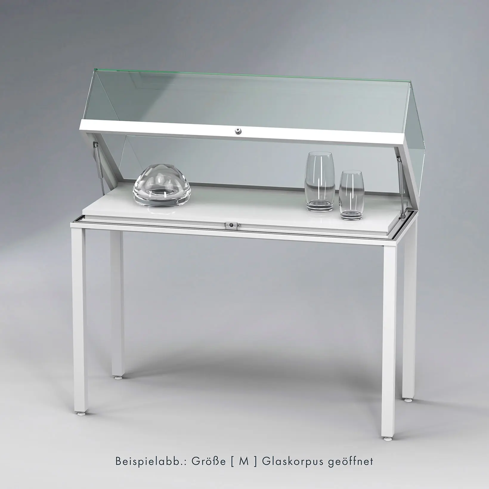 Tischvitrine Ganzglas mit Standbeinen - Design-Vitrine für Museen, Ausstellungen oder das exklusive BüroRahmenlose Ganzglas-Konstruktion mit 8mm ESG-SicherheitsglasGrößen B/H/T1000 × 970 × 500 mm1200 × 970 × 500 mm1400 × 970 × 500 mmHöhe des Glaskorpus 220 mm Öffnung - Glaskorpus aufklappbar mit seitlichen Gasdrucköffnern,die den Aufbau arretierenVerglasung - Einscheiben-Sicherheitsglas / ESGOberfläche - RAL-9010, Reinweiß oder RAL-9005, Tiefschwarz - RAL-Classic Farbtöne nach WunschBeleuchtung - ohne Beleuchtung - optional: waagerechte Strahlerschiene mit LED-Strahlern, inkl. TrafoSchließung - Sicherheitsschloss mit 2 Schlüsseln
